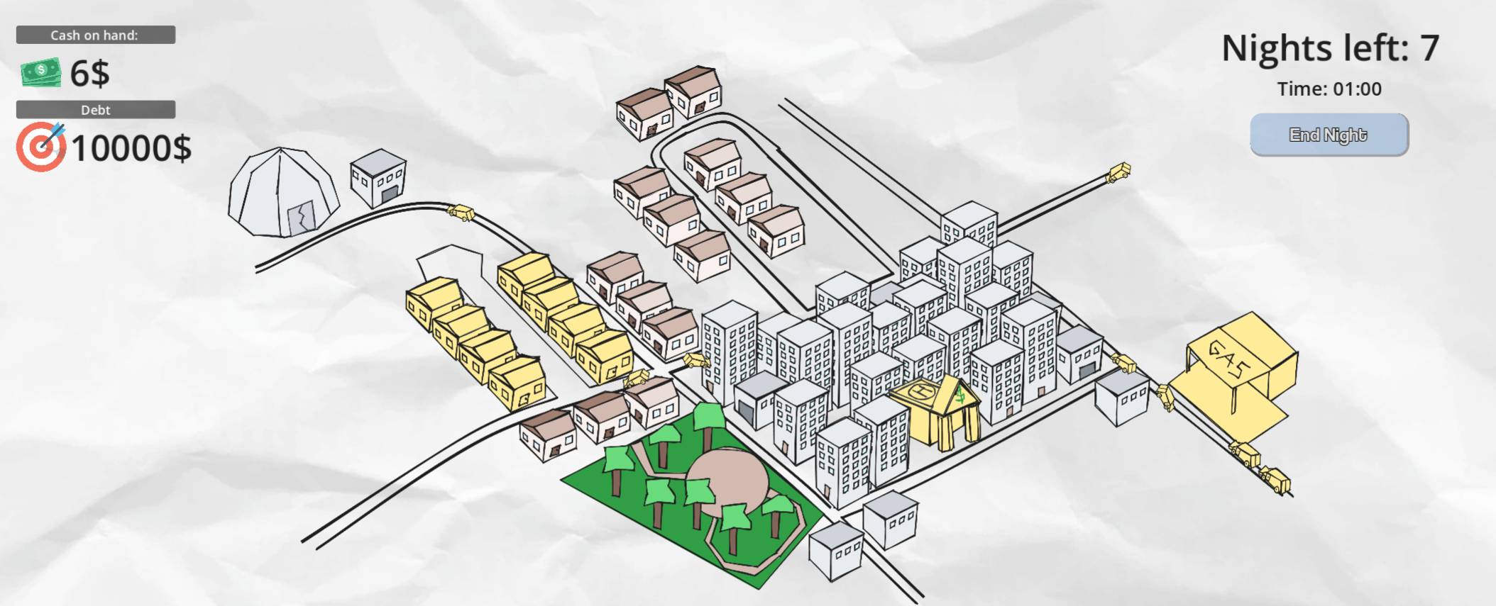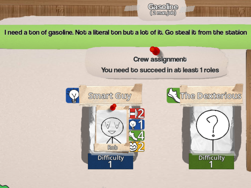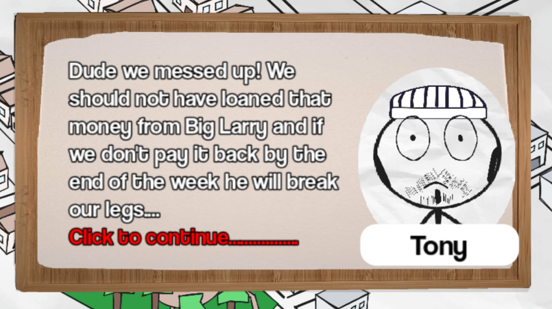 Your grand idea went south and now you are indebted. Your new grand plan is to start a gang and cancel your involuntary "knee removal" surgery by stealing the cash you owe you loan shark. Good luck and don't get caught!